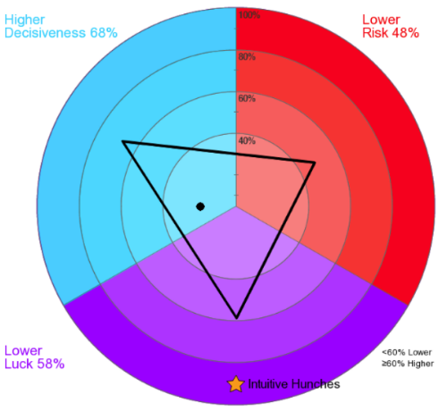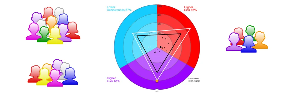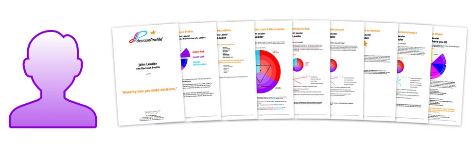 The Decision Profile is a psychometric instrument designed and developed to explore how people make decisions, and to illustrate the underlying elements of their decision making profile. The tool specifically measures an individual’s attitudes to three decision making elements; RISK, LUCK, and DECISIVENESS. It then creates a unique, personalised profile for individuals, group or whole organisation by assessing how these three elements interact.